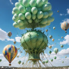 A whimsical, towering structure resembling a balloon-filled tree rises against a bright blue sky, surrounded by colorful hot air balloons and an artistic crowd below.