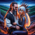 A striking couple stands in a lush landscape. The man has long hair and tattoos, while the woman sports flowing silver hair and a dramatic headpiece. They exude confidence against a mystical backdrop.