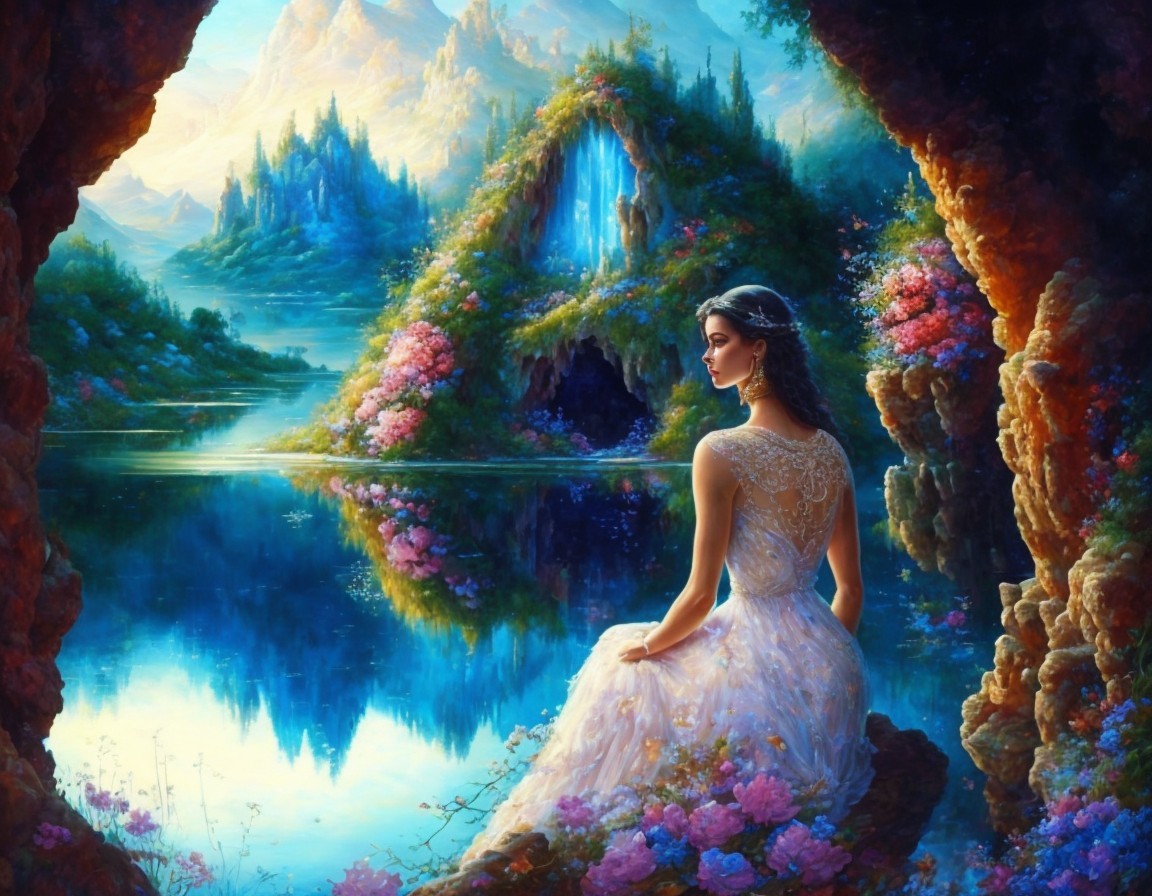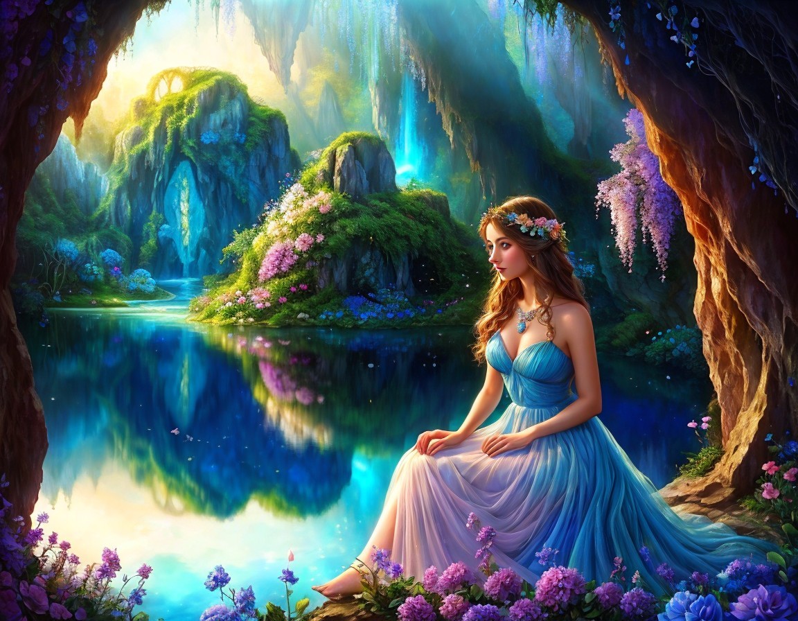 A beautiful woman in a blue dress sits in a cave and looks at the lake. The cave is overgrown with hanging flowers. Romantic, elegant, magical and imaginative.