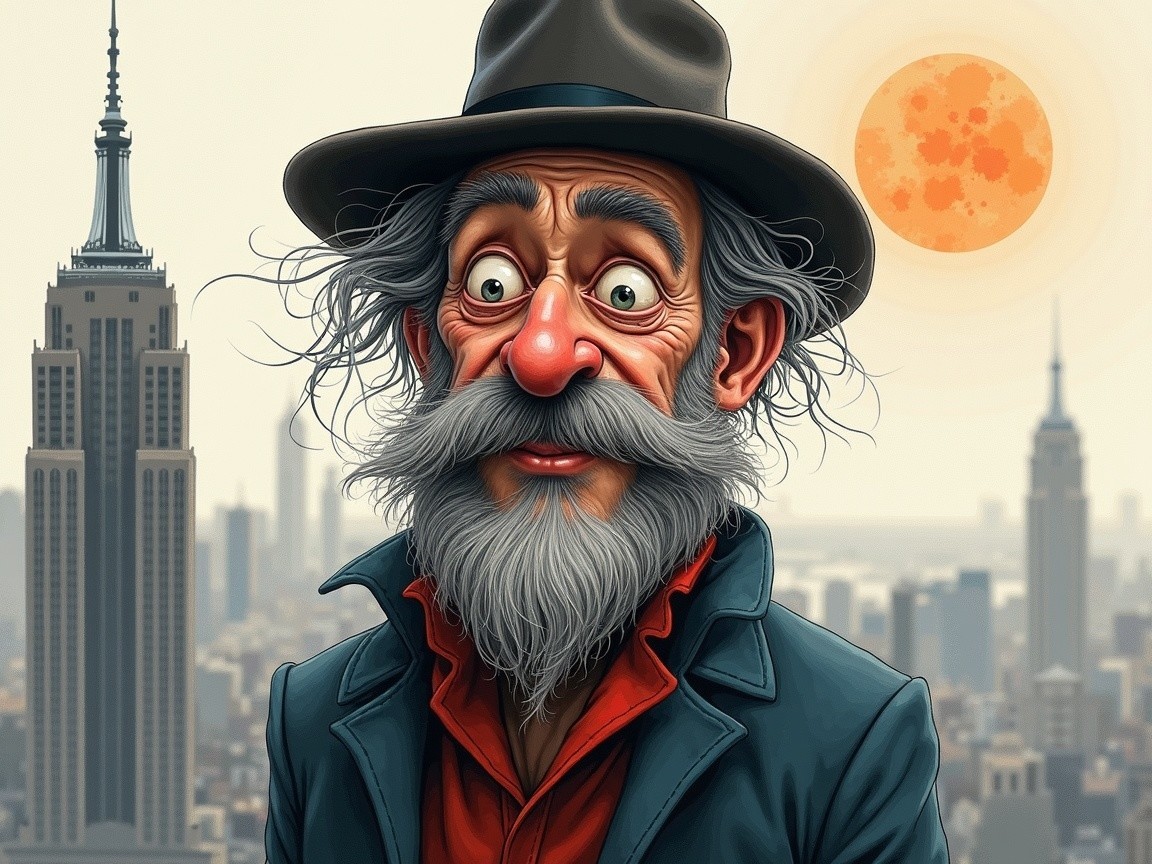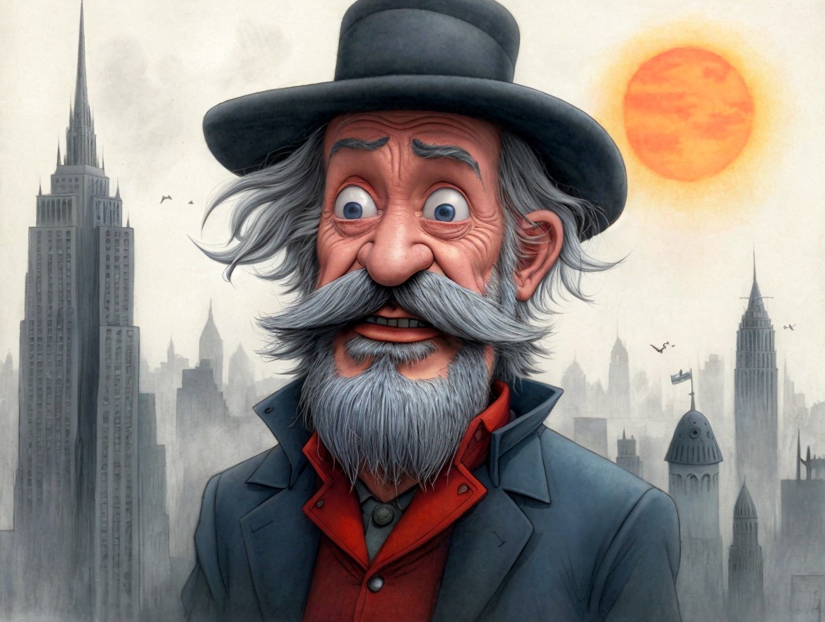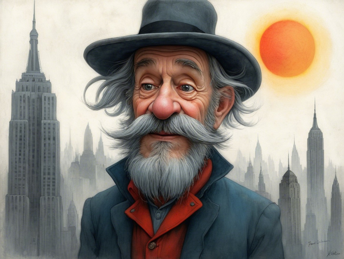 A whimsical portrait of an elderly man with a bushy white beard and a wide-brimmed hat, set against a stylized city skyline and a bright sun, conveying a mix of nostalgia and charm.