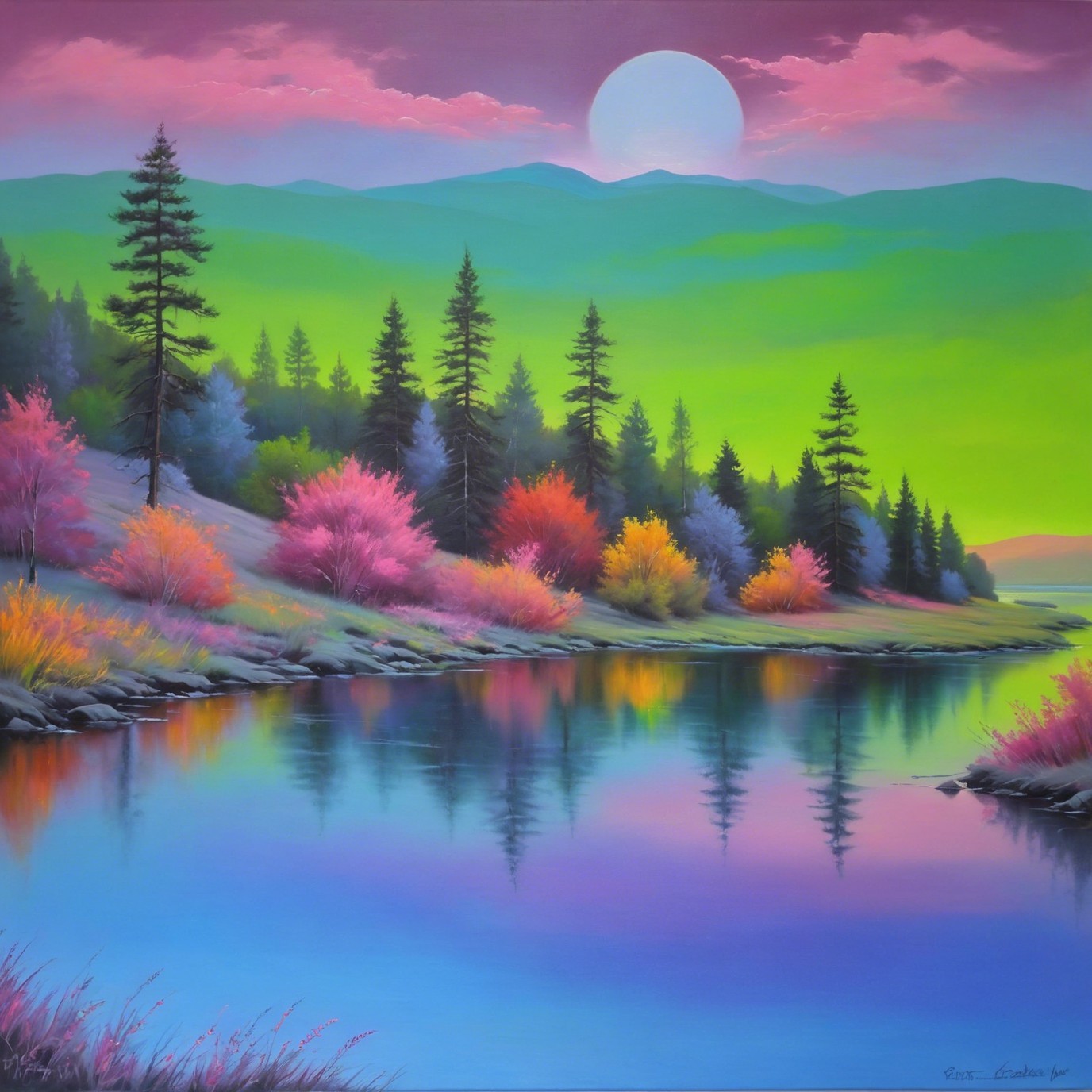 An oil painting depicts a vibrant, dreamlike landscape at twilight, with a large, pale full moon presiding over a serene river scene. The sky is a bold blend of magenta and violet, with soft, slightly textured clouds, hinting at an ethereal atmosphere. In the distant background, rolling hills in shades