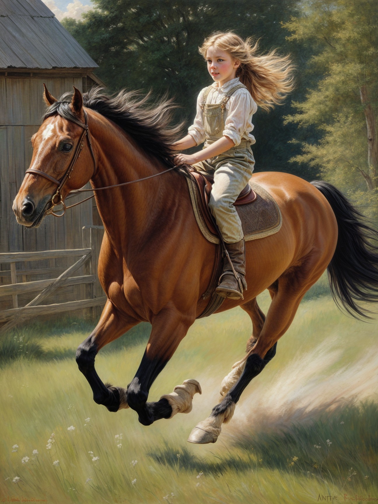 Prompt: "A graceful, fluid, and dramatic oil painting depicting a young girl (with a plain face and wearing dungarees) riding a muscular horse at a full gallop away from the family's barn . The wind is in the girl's hair and a look of sheer exhilaration is on her face