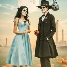 A dramatic scene features a woman in a blue gown with dark makeup and a man in a long coat and hat, both posed among carved pumpkins against a spooky moonlit cemetery backdrop.