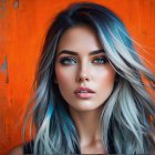 A portrait of a young woman with a serene expression, featuring watercolor splashes in blue and orange surrounding her. The vibrant background contrasts beautifully with her natural beauty.