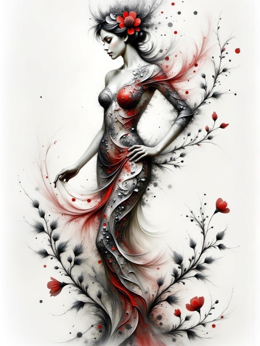 A graceful figure in a stylized dress adorned with floral patterns, complemented by red and black tones. She stands amidst elegant roses, blending beauty and artistry in a captivating pose.