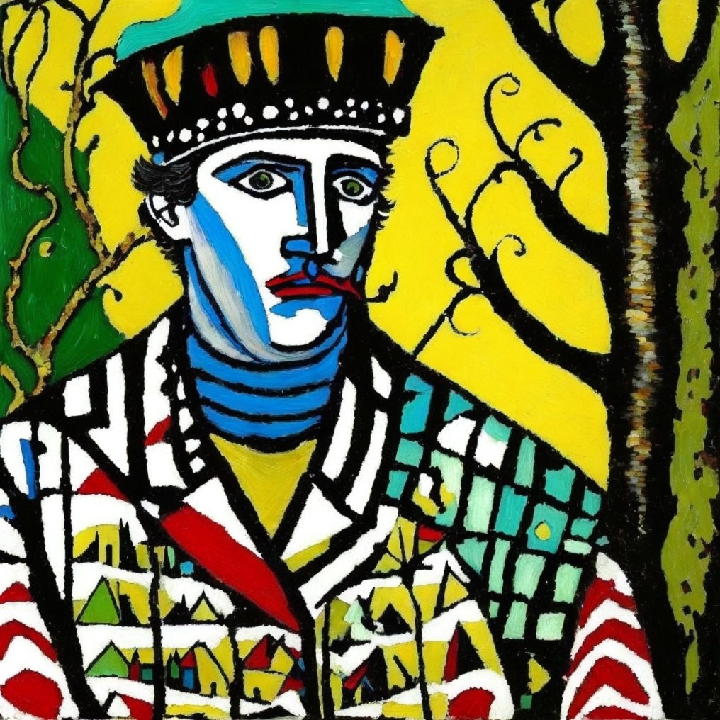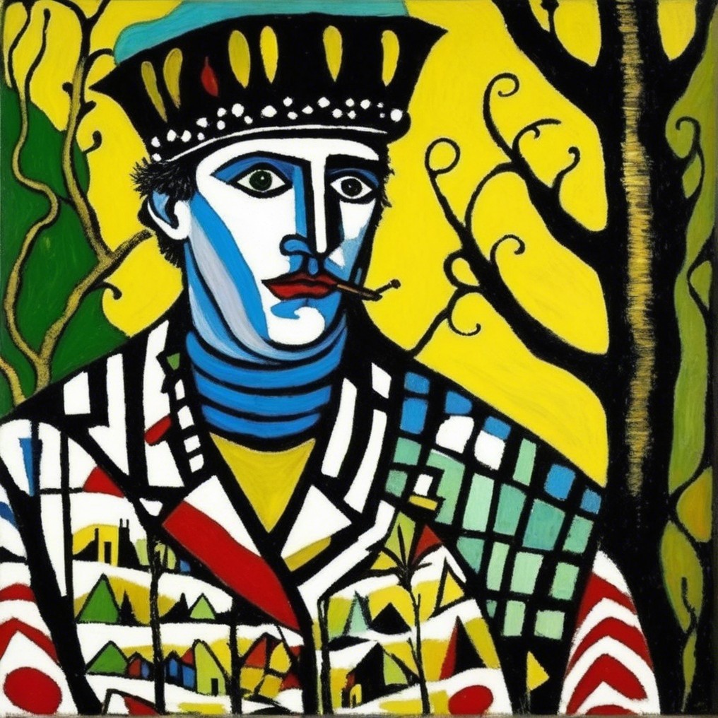 Artistic Statement: This piece merges Fauvism’s bold colors, Cubism’s fractured geometry, and Expressionism’s emotional weight to construct a figure both regal and restless. The checkerboard of patterns, reminiscent of Fernand Léger’s mechanical compositions, adds structure, while the stark facial contrast reflects Pablo Picasso’s African Period. The background’s organic forms contrast rigid structures, echoing the duality of tradition versus modernity.