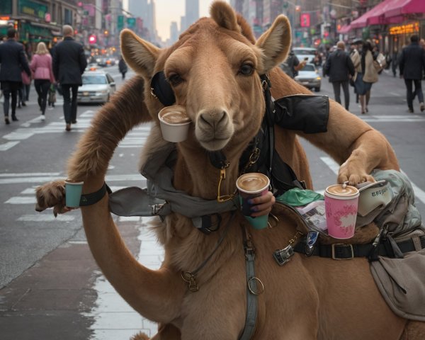 A whimsical scene featuring a ceramic woman in an apron, preparing tea at a quaint kitchen setup. Surrounding her are vintage utensils, plants, and a charming backdrop of soft clouds. L'heure du thé aux nouilles dans une cuisine pittoresque. ᕙ༼◕ ᴥ ◕༽ᕗ