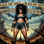 A muscular figure stands confidently in a dramatic landscape, wearing short denim shorts and a fierce expression. Bold text above her humorously questions, "Who wears short shorts?"