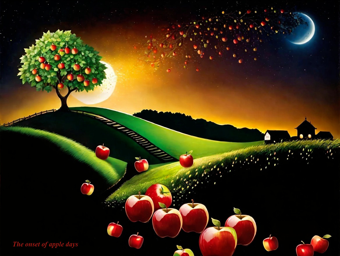 A vibrant painting of a lush landscape with apple trees, scattered fruits on the ground, a path leading to cozy cottages under a twilight sky.