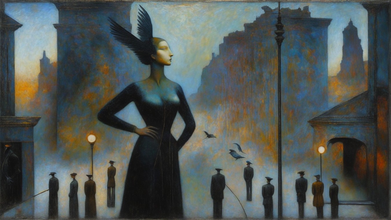 A solitary figure in a dark coat stands at the intersection of narrow, shadowy streets, holding a small object. The scene is illuminated by a bright moon, evoking a surreal, dreamlike atmosphere.