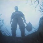 A low-angle shot of a silhouette of a man holding a shovel in his right hand and a wooden stick in his left hand, standing on a hill in a forest at night, with bare branches from trees surrounding him, against a blue night sky, which is lighter directly behind him creating a glowing