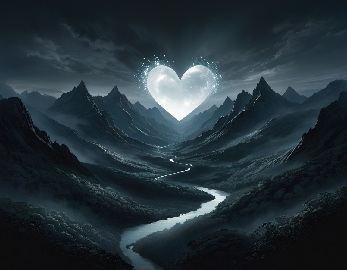 Prompt: Heart-Landscape: Central to the image, a heart envisioned as a vast and intricate landscape, where the terrain itself symbolizes emotional and spiritual states.Light Forces: Represent virtues as radiant entities, perhaps angelic beings or streams of gentle, healing light, actively engaging with the heart’s landscape.Dark Agents: Contrast with manifestations of doubt and negativity, visualized as shadowy figures or dark mists, encroaching upon the heart's terrain.Human Core: Overlay a translucent figure symbolizing the person whose heart is the battleground, their posture and expression reflecting the inner turmoil and hope.Symbols of Struggle: Integrate elements like fragmented chains in areas where light prevails or withering flora where darkness dominates, to depict the ongoing conflict and transformation.Contrasting Palette: Employ a color scheme that vividly contrasts the warmth of light areas against the coolness of dark zones, enhancing the visual metaphor of the battle.This image concept aims to creatively visualize the complex inner battle of light and darkness within one’s heart, capturing both the struggle and the potential for personal transformation