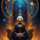 A regal figure sits on a magnificent throne adorned with stars and cosmic elements, radiating wisdom and serenity. The background features a mesmerizing galaxy, enhancing the mystical ambiance.