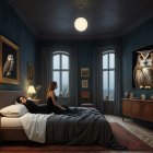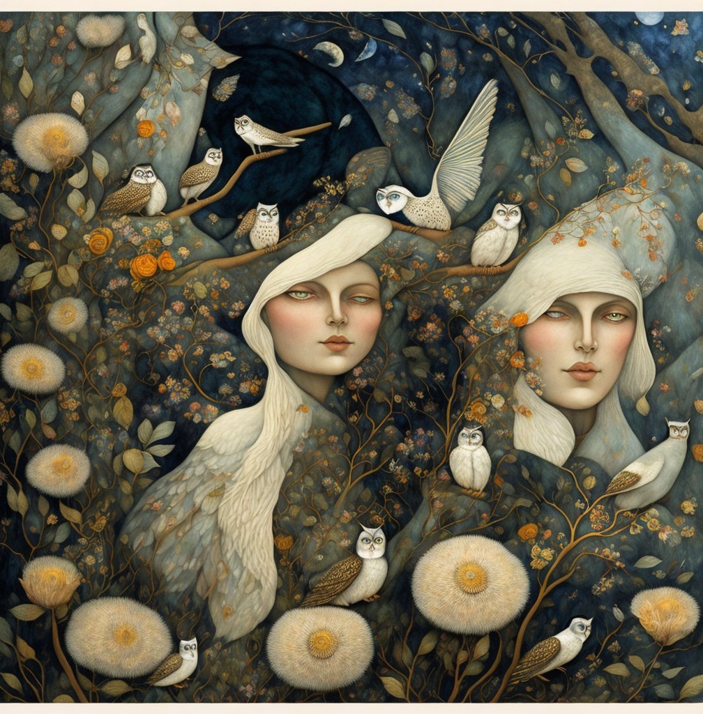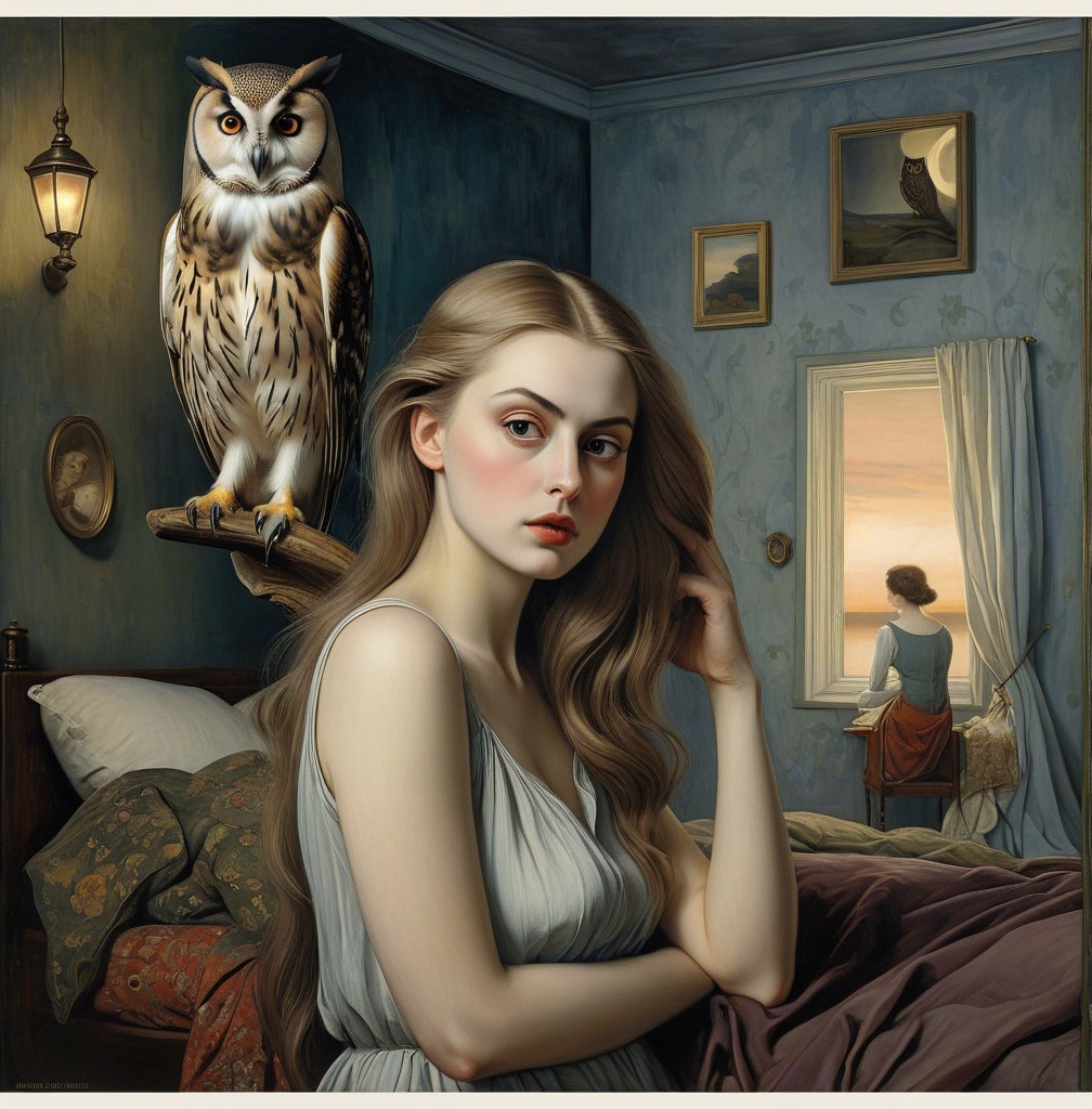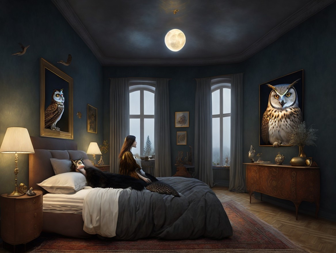 A young woman with red hair gazes thoughtfully, surrounded by owls. The moonlight casts a serene glow, illuminating her delicate features and the tranquil night scene.