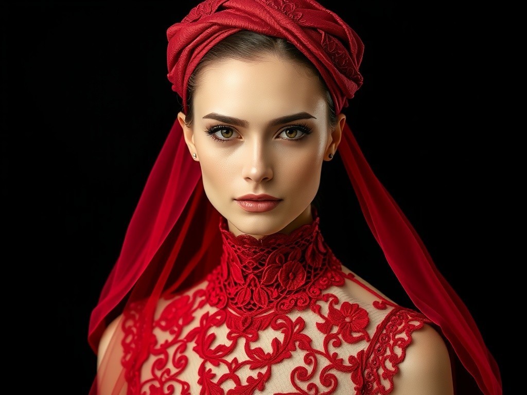 The portrait captures a striking woman in a red lace garment against a black background. Her symmetrical features and intense gaze are enhanced by a complex headpiece and flowing veil, creating an aura of elegance.