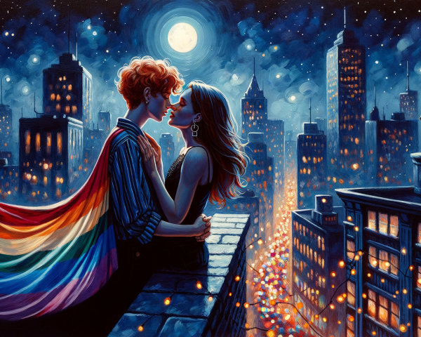 A cozy art studio scene features two women, one with vibrant red hair and the other with a striking Afro, sharing an intimate moment. Art supplies surround them, highlighting their creative bond.