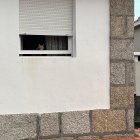 Prompt: Create an abstract impressionism portrait of a tabby orange cat sneakly peeking through the window, as seen from the exterior of it, from some distance, on a cloudy afternoon, right before a storm. Use impasto, brush strokes, underpainting, harsh tones of white, grey, black, dark red in a nearby rooftop,, orange.