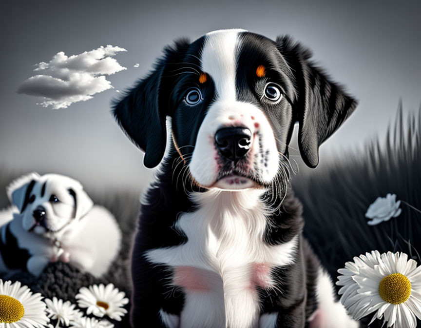 Prompt: The main cute little black and white puppy that is sitting in a floral field has turned and tilted his head to the side because he hears a sound (the airplanes in the background)
