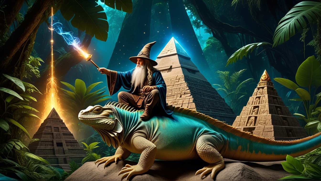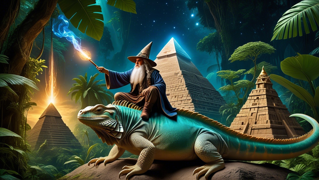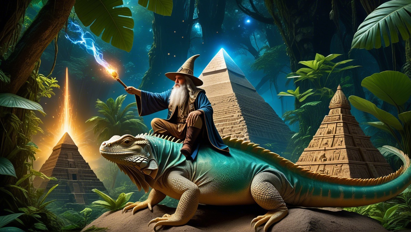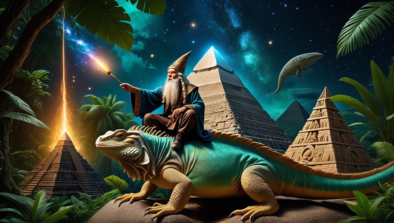 A vibrant scene showcasing a colorful lizard in front of ancient pyramids, surrounded by lush greenery and a cosmic sky filled with planets and stars, with a mysterious beam of light emanating from the ground.