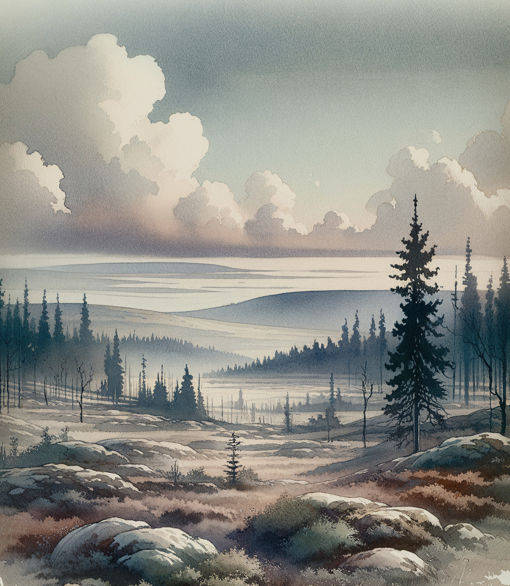 A serene landscape featuring rolling hills and a distant lake, shrouded in soft mist. Tall evergreens and rocky terrain frame the scene under a sky filled with fluffy, white clouds.