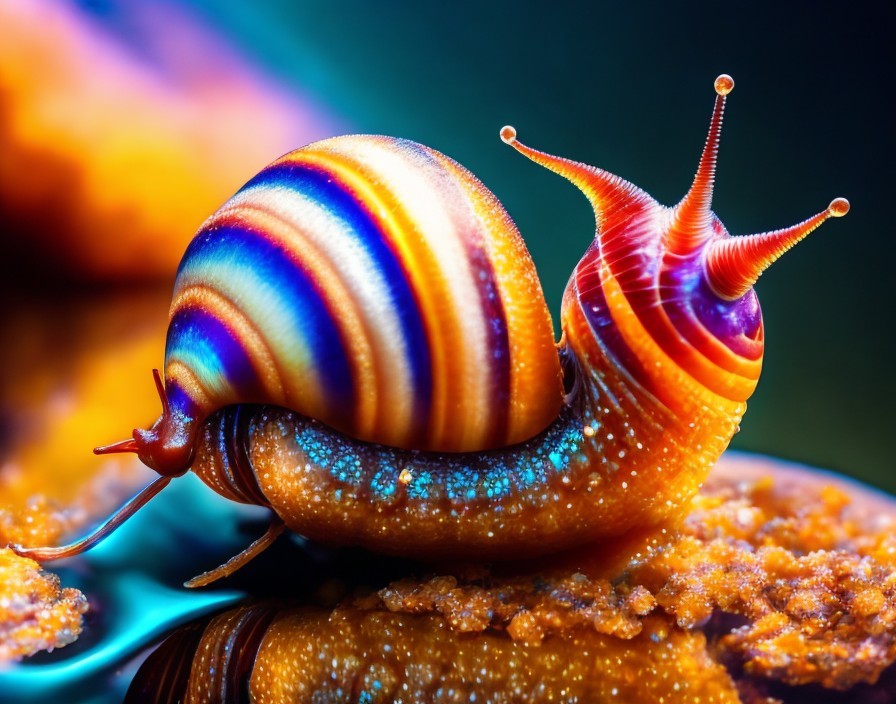 A vibrant snail with a striped shell crawls on a surface with a blurred background, displaying prominent antennae and a detailed texture.