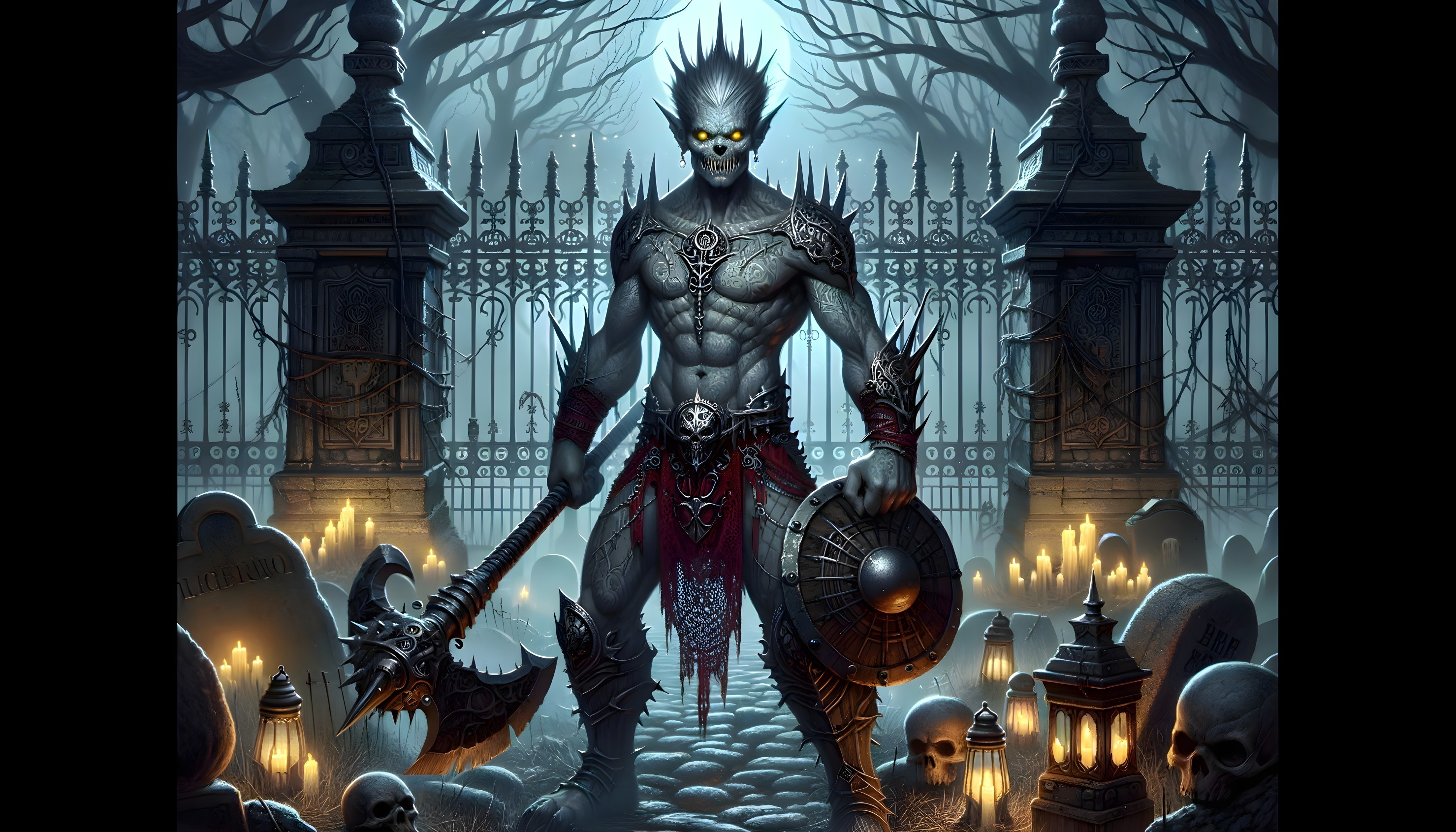 An ominous, gray-skinned creature with pointed ears, sharp teeth, and yellow eyes stands in a spooky cemetery at night. It wears a silver spiked crown, red lace boxer shorts, and black boots, wielding a shield and battle axe. The eerie scene is lit by glowing candles and lanterns, with mist adding to the atmosphere of dread.