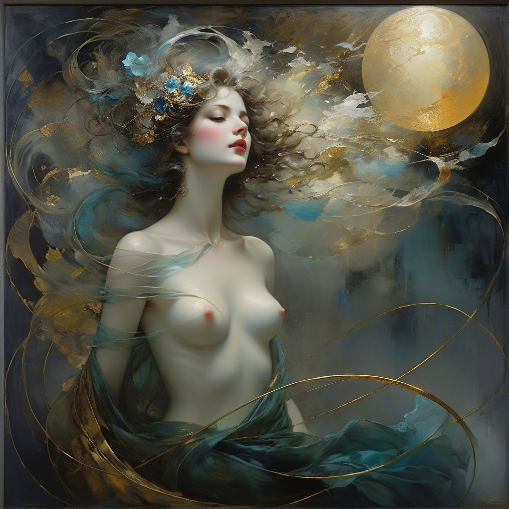 A graceful woman with flowing hair adorned in an elegant bronze and teal outfit, gazes serenely at a glowing moon, surrounded by soft, swirling fabrics and ethereal light.