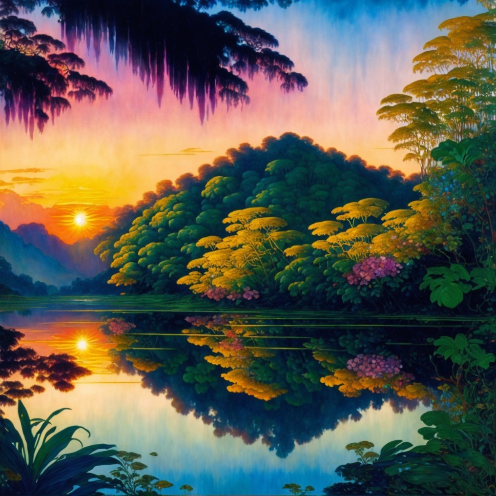 + Prompt:Full page, single image, 3D watercolor patchwork, spectacular sunset by William Turner, high-definition lush rainforest, lacy silver-sheened green plants and ferns, multi-color night blooming flowers, by Alphonse Mucha, with elements in the style of Gustav Klimt and elements in the style of Jan Toorop