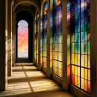 A grand, ethereal hall features vibrant stained glass windows and soft golden light. Musical notes swirl through the air, centering on a large guitar, evoking a sense of harmony and wonder.