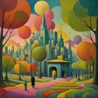 A whimsical landscape features vibrant, oversized trees and surreal mountain peaks. Two figures walk a curving path under a colorful sky filled with planets, creating a dreamlike atmosphere.