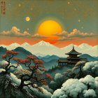 A serene landscape featuring a traditional pagoda nestled among mountains and trees. A vibrant sunset bathes the scene in warm hues, with a bright moon and soft clouds completing the tranquil atmosphere.