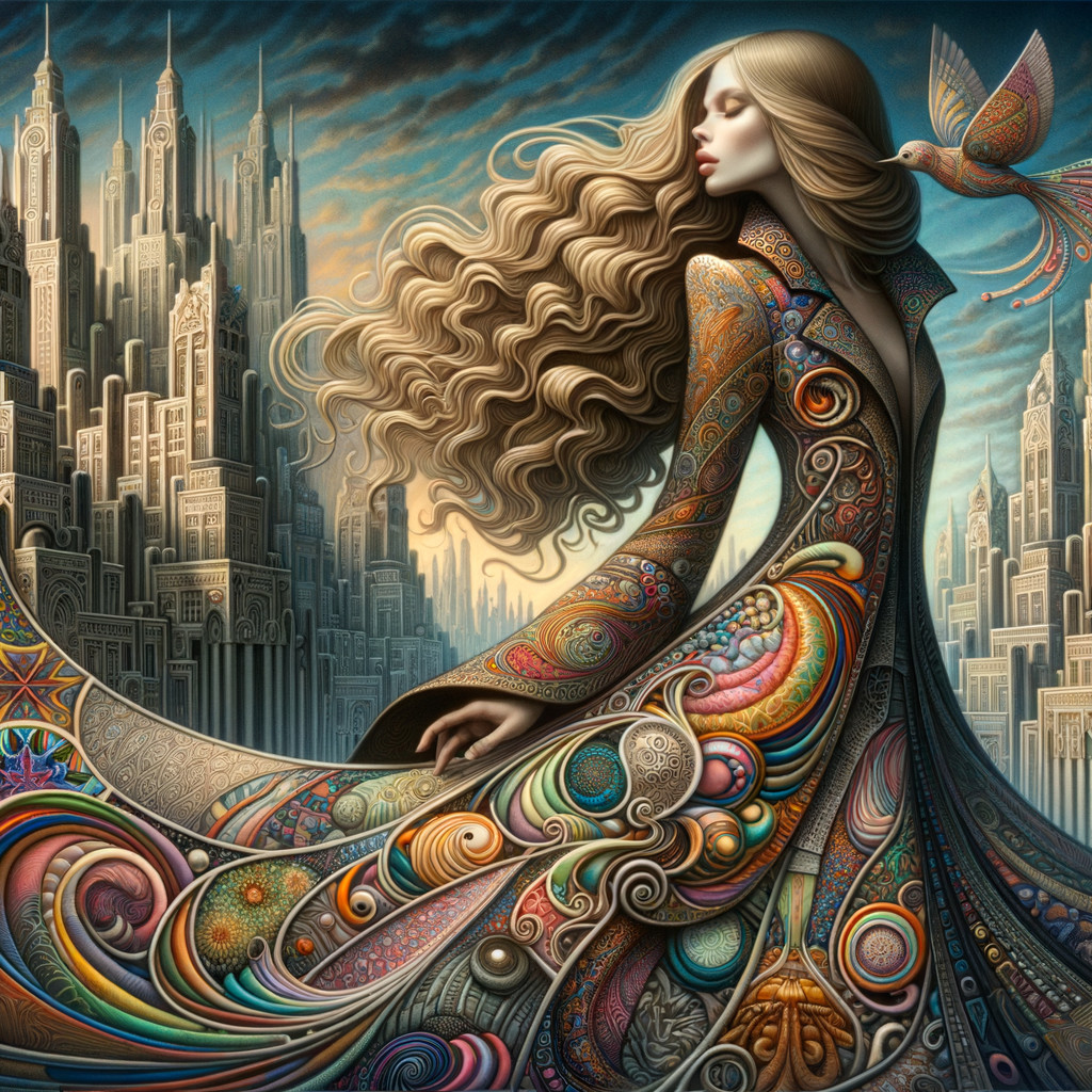 A surreal illustration juxtaposes a woman with flowing hair and ornate dress against a fantastical cityscape, with a colorful bird soaring overhead.