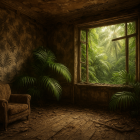 Prompt: Interior of a decayed opulent living room, old wooden floor covered with debris, peeling and cracked wallpaper, broken window frame wide open. Through the shattered window, a lush tropical jungle with overgrown palm trees invading the room. Green palm leaves extend, blending with black and white palm-patterned wallpaper. Strong natural light, sepia and monochrome tones, post-apocalyptic atmosphere where nature reclaims its place. Highly detailed, realistic photography, cinematic composition, hyper-detailed.