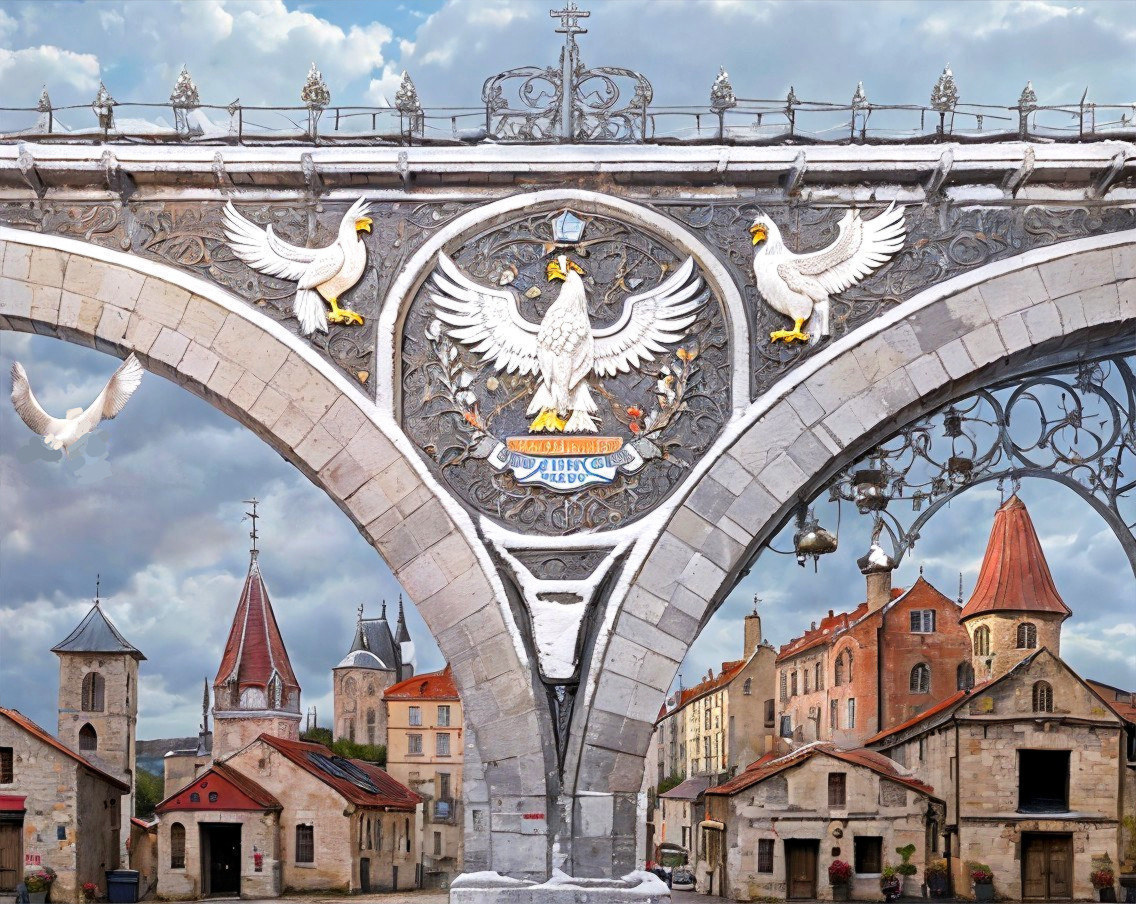 + Prompt:Style by Maurice Utrillo. There are old carriages on a viaduct, a large coat of arms with a white eagle in the middle, white chickens, behind them is an old town with towers, houses, old stone walls, antennas and church towers, and sky above.