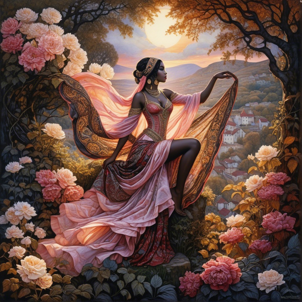 A majestic figure in a flowing, colorful gown stands against a sunset backdrop, surrounded by vibrant trees and a serene landscape, exuding elegance and a sense of wonder.
