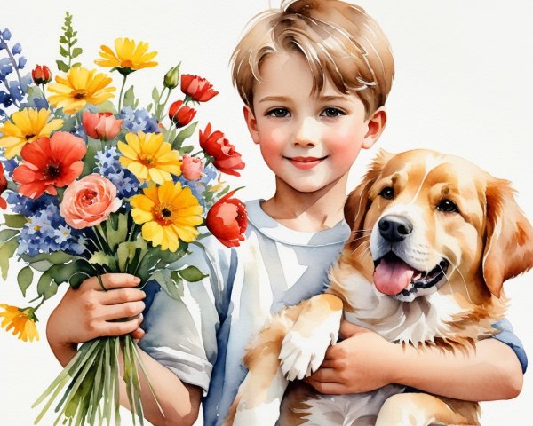 A serene forest scene features a charming wooden house with glowing windows. A horse stands nearby, surrounded by trees and vibrant flowers, evoking a whimsical, peaceful atmosphere.