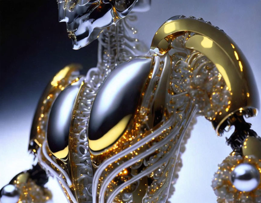 Sinews, ligaments, bone gilded in crystalline chrome. Cybernetic features. Double Body Exposure lightning. LEDs. Platinum Onyx and Gold Metallic flesh. Anatomically correct. More Android than Human. Surreal.