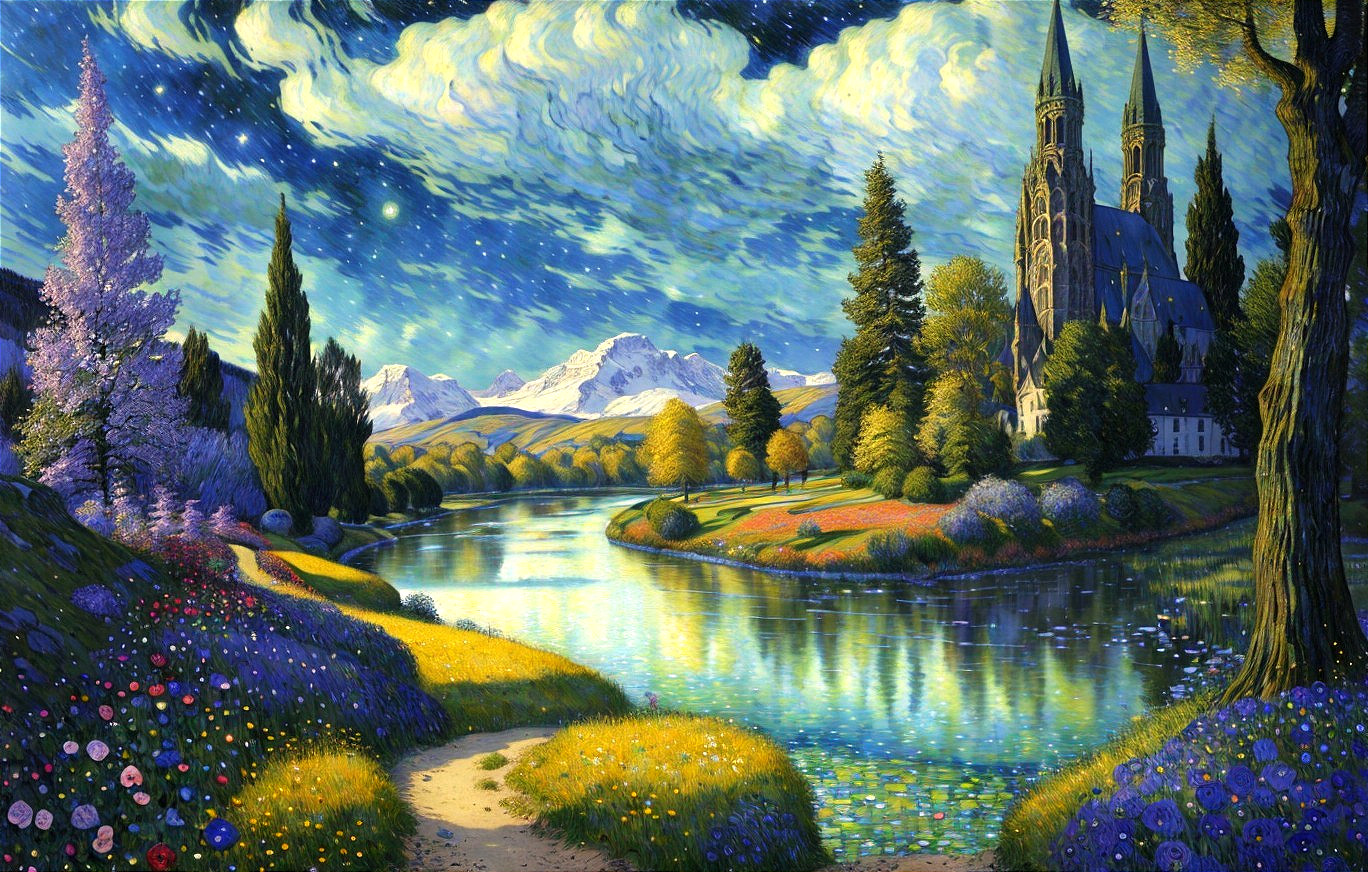 A vibrant landscape painting with a starry sky, a church near a river, colorful flowers, and distant mountains.