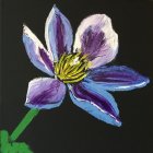 A vibrant, stylized flower blooms against a black background, featuring swirling petals in shades of purple, blue, and white, detailed with a bright yellow center and lush green leaves.