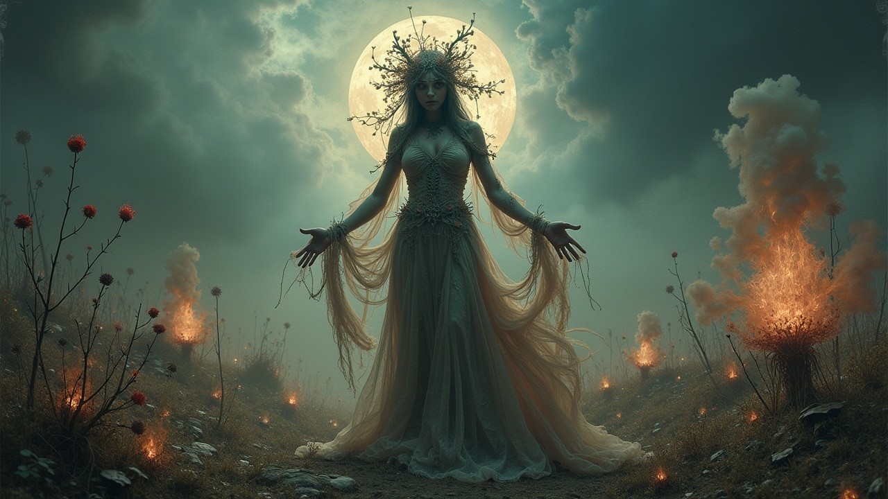 A mystical figure adorned with floral elements stands in an ethereal landscape, surrounded by eerie mist and glowing flowers, under a luminous full moon, evoking a sense of enchantment and mystery.