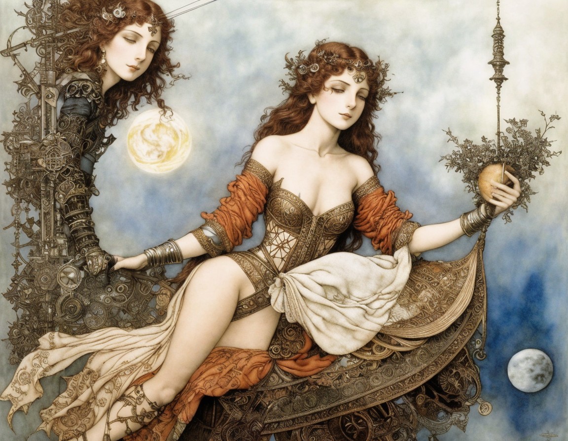 The image features a beautiful woman in a detailed fantasy setting, adorned in an intricate outfit. She holds a lantern and gazes thoughtfully, surrounded by mechanical elements and a serene sky.
