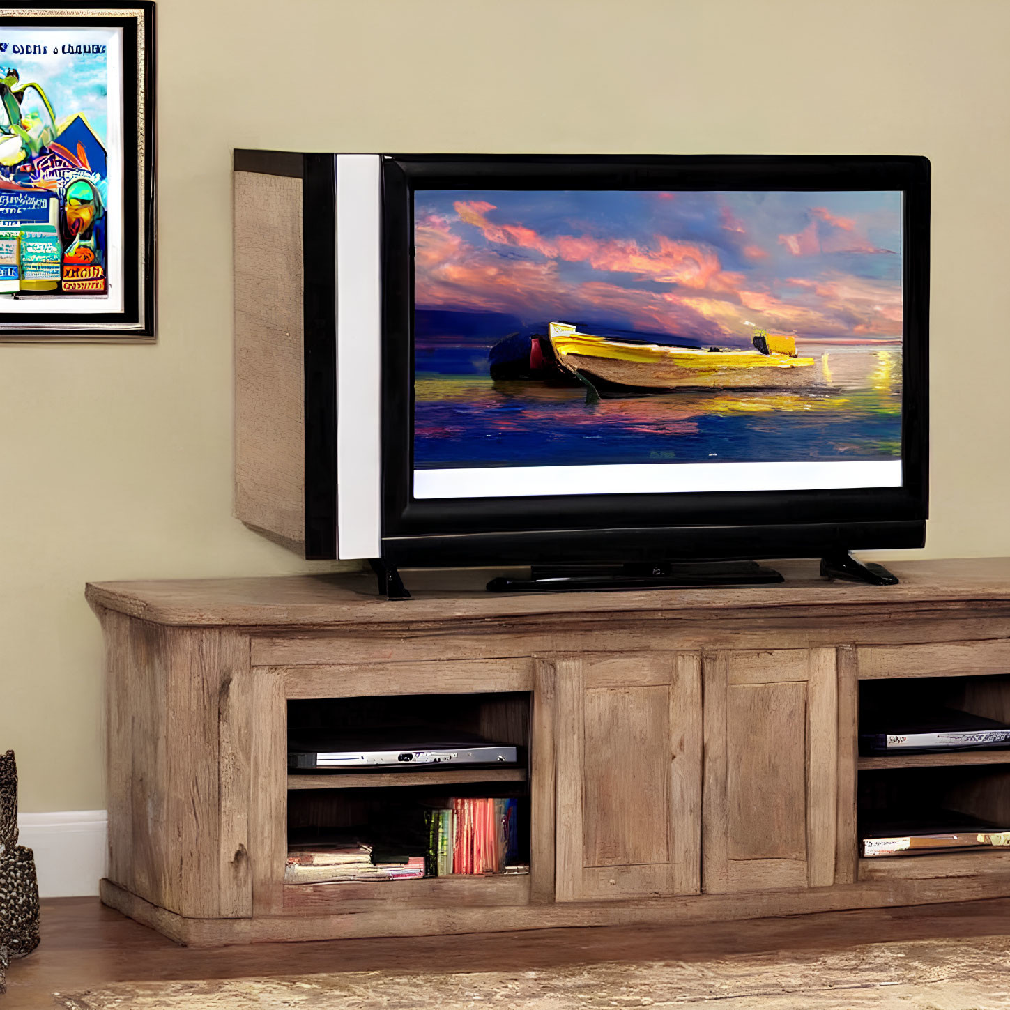 Flat-Screen TV on Wooden Console with Cabinets and Photo Frame