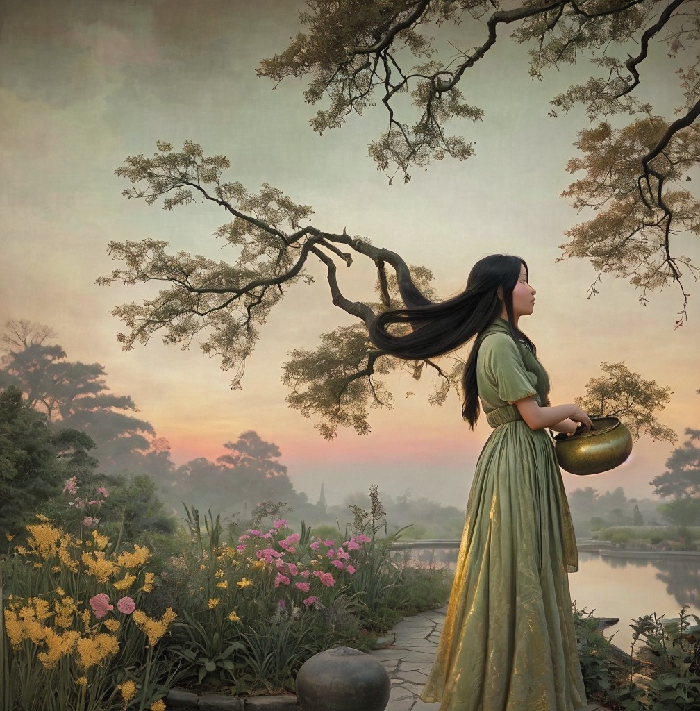 A serene scene unfolds as a woman in a flowing green garment stands beside a tree, her long hair gently swaying in the breeze, with a tranquil sunset illuminating a lush garden landscape.