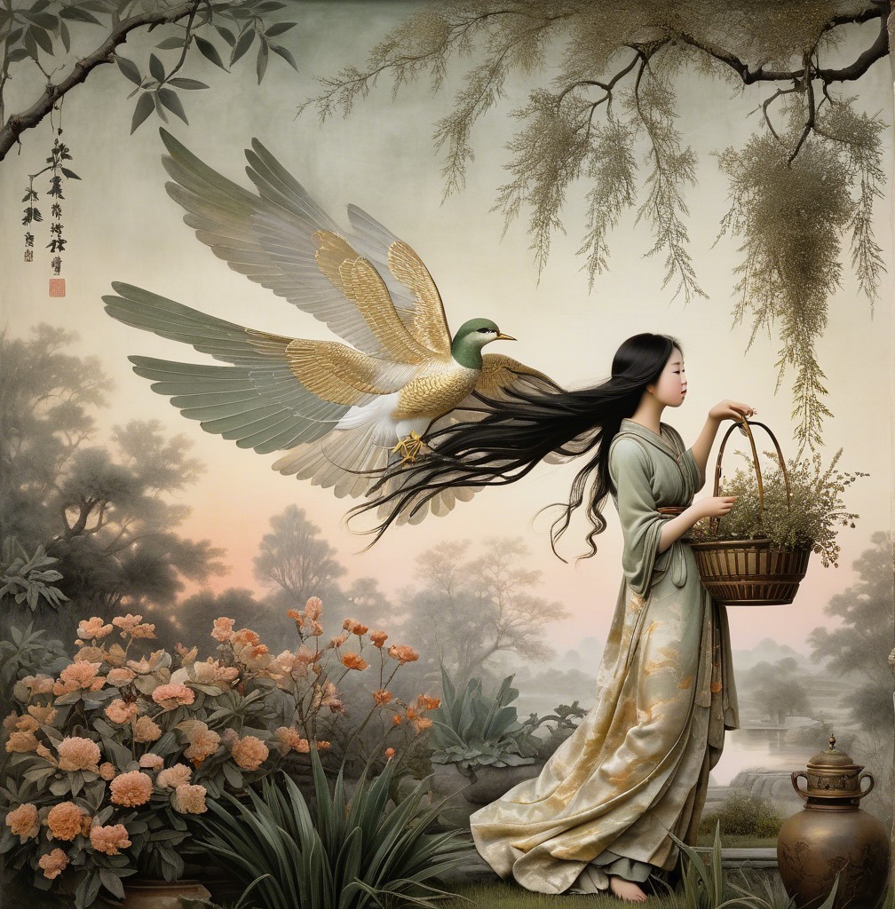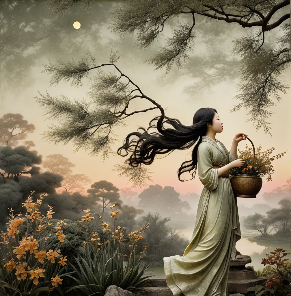 + Prompt:Girl in a beautiful garden at sunset, 3rd century Chinese miniature art, Velvet blush olive green, sage, Shabby, Dull Gold, Amber Gray, marbled. dramatic