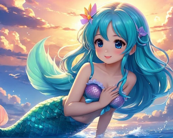 A charming anime superheroine with vibrant blue hair, bright eyes, and a playful outfit featuring a short skirt and knee-high boots. She wields a magical staff and has a confident, friendly demeanor.