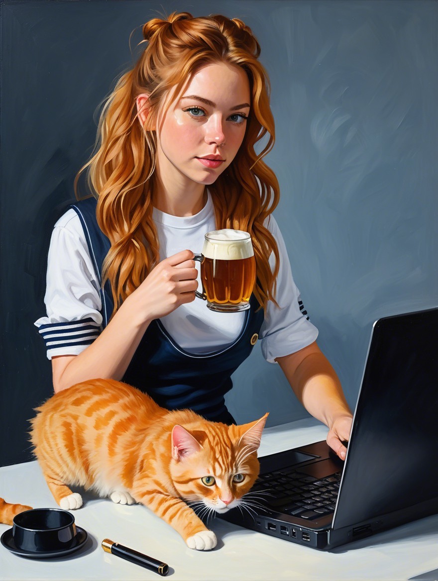 A young woman with long, wavy hair holds a beer while typing on a laptop. An orange tabby cat lounges on the table, creating a cozy, relaxed atmosphere in the scene.