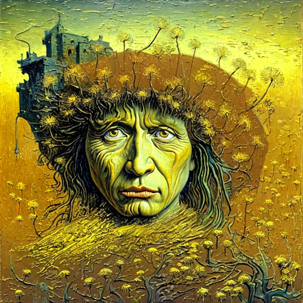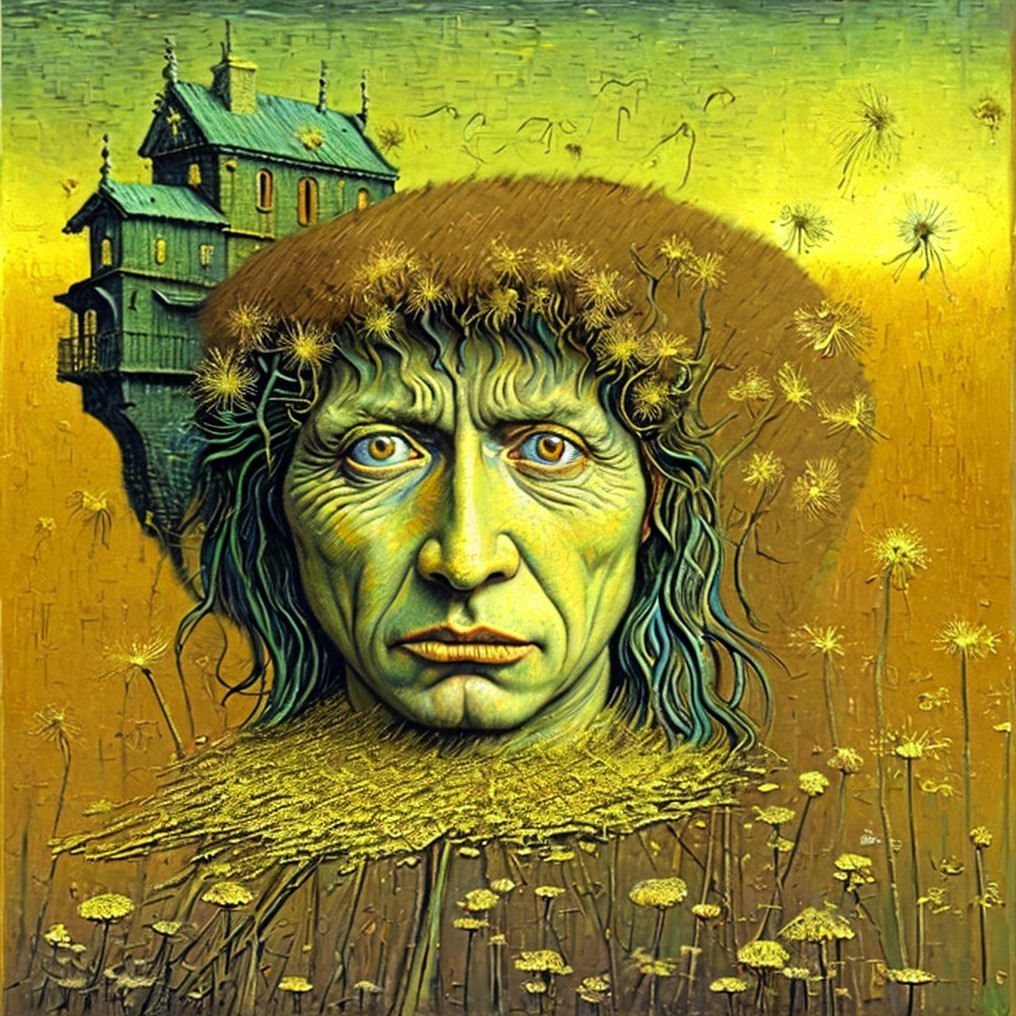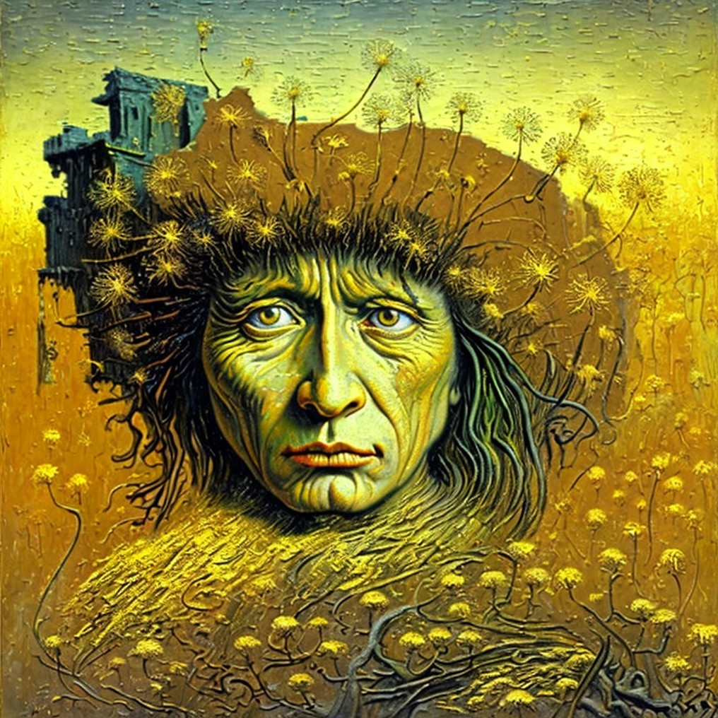 "The Uncanny Dandelion Keeper" explores the eerie intersection of humanity and nature, merging surrealism with organic symbolism. The figure represents both a caretaker and embodiment of transience, with dandelions symbolizing cycles of life and death. Influenced by Beksiński’s haunting surrealism, Bosch’s symbolic depth, and Magritte’s enigmatic compositions, the piece blurs the lines between the familiar and the uncanny, evoking existential unease.