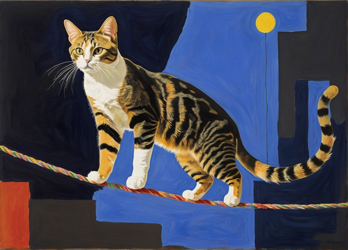 A colorful cat elegantly balances on a rope against a vibrant abstract background. The striking colors and bold shapes create a whimsical, artistic atmosphere.