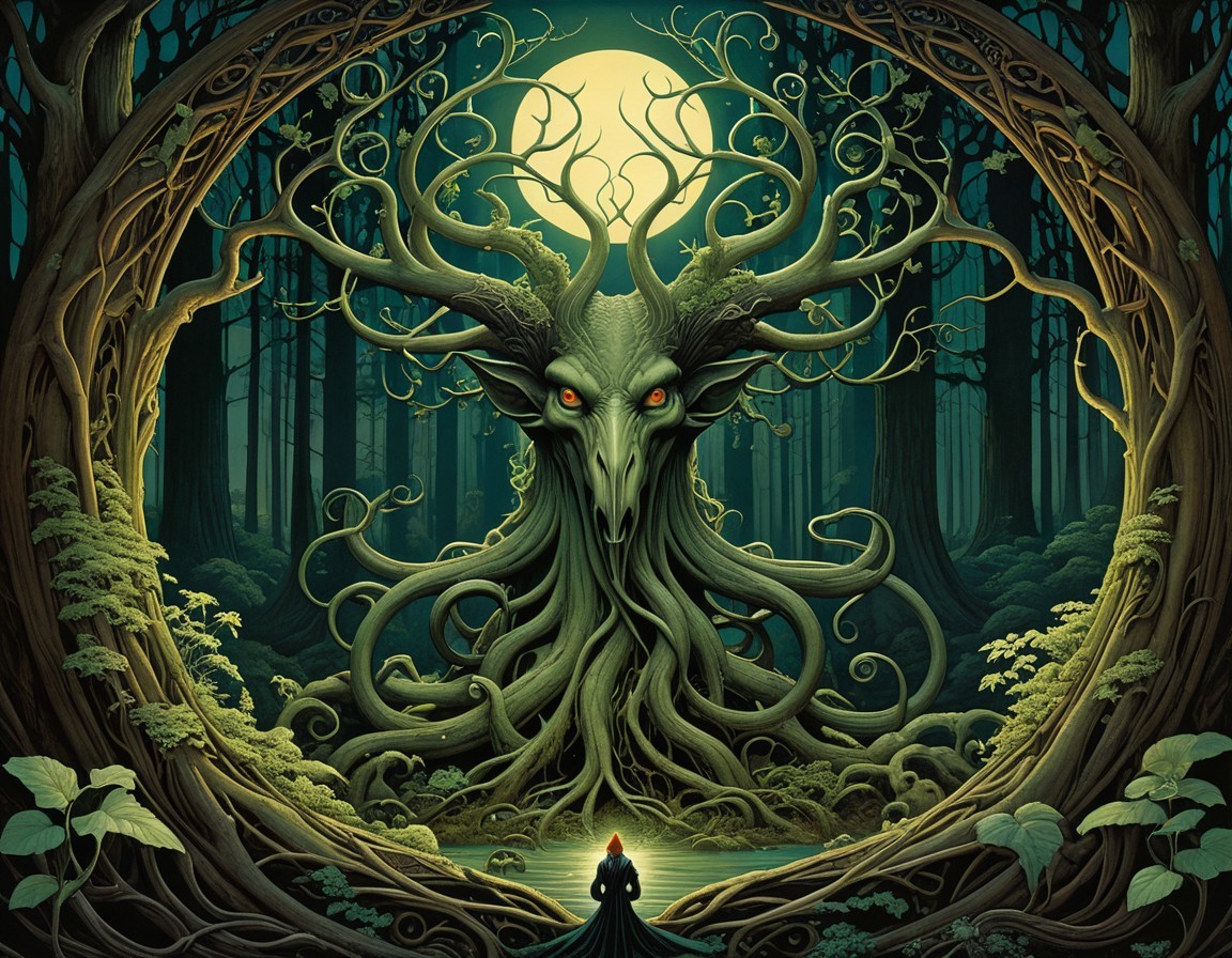 Prompt: Art Nouveau, Lovecraftian forest sigils.