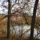 A serene autumn scene featuring a calm river surrounded by trees with vibrant fall foliage. The warm colors of the leaves reflect the tranquility of the landscape in the gentle sunlight.